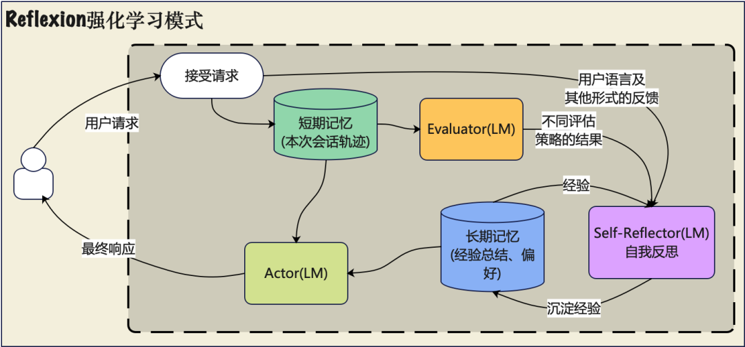 《Reflexion: Language Agents with Verbal Reinforcement Learning》https://arxiv.org/abs/2303.11366中提出了一种 Reflexion 的强化学习框架,它由三个不同的模块组成:Actor、Evaluator 和 Self-Reflection。