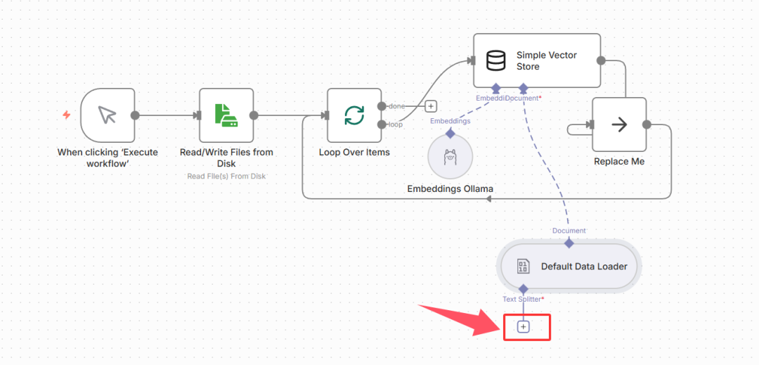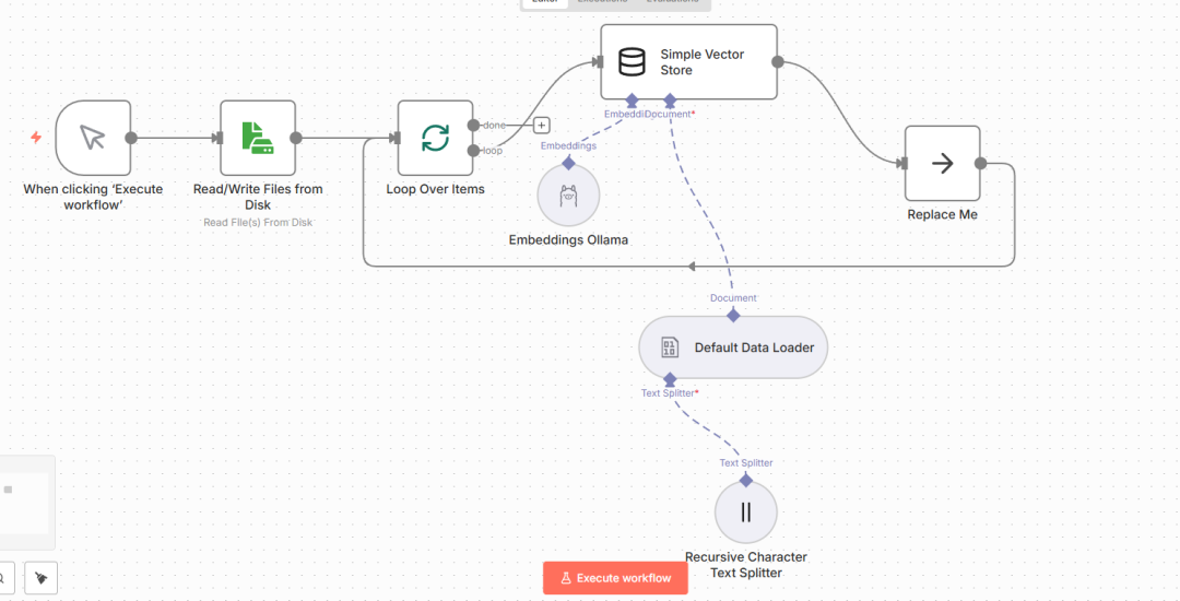 n8n提供可视化拖拽式操作,无需大量编码即可完成RAG工作流搭建,核心流程为:文件读取→循环处理→向量存储→文本分块→模型配置,步骤如下: