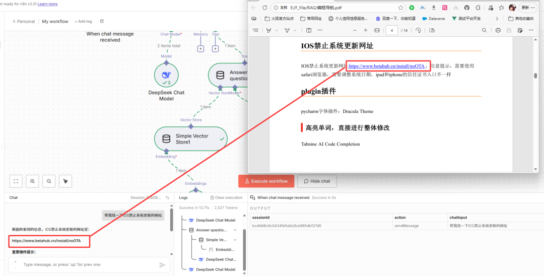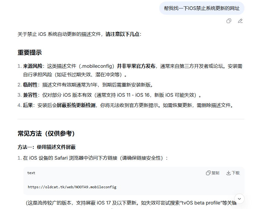 open chat按钮,弹出对话窗口。 - 输入测试问题:例如“找一下ios禁止系统更新的网址”(该问题对应的答案需存在于本地知识库文件中)。