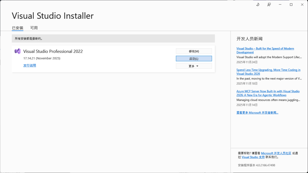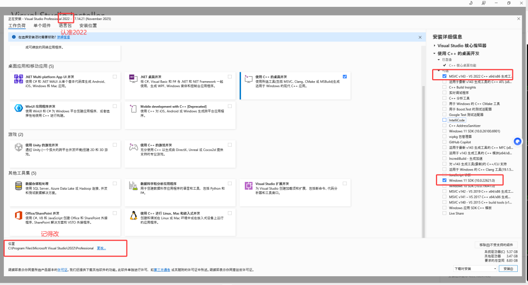 ② 解决方案:安装Visual Studio 2022版本的C++桌面开发工具(2026版本暂不兼容npm,不推荐)。