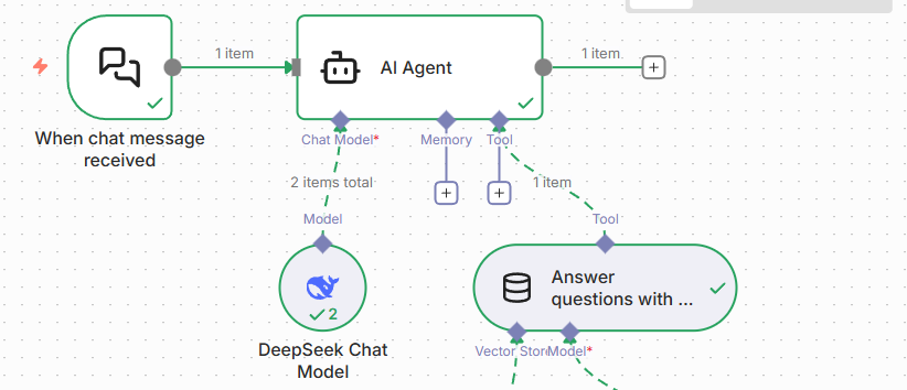 AI Agent,选择该节点。 - 配置Chat Mode:选择对话模型(本次使用Deepseek,需提前获取API Key;也可使用Ollama本地部署的大模型,如Qwen3)。