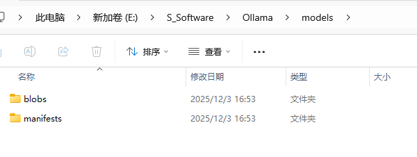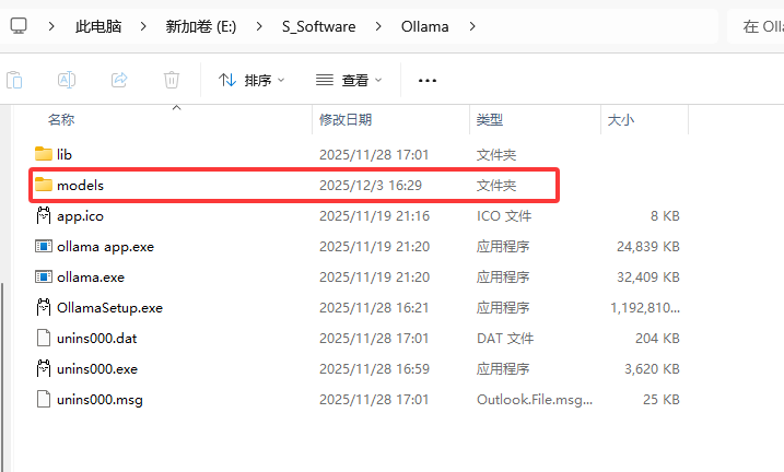 在Ollama安装目录下新建models文件夹,路径为:E:\S_Software\Ollama\models
