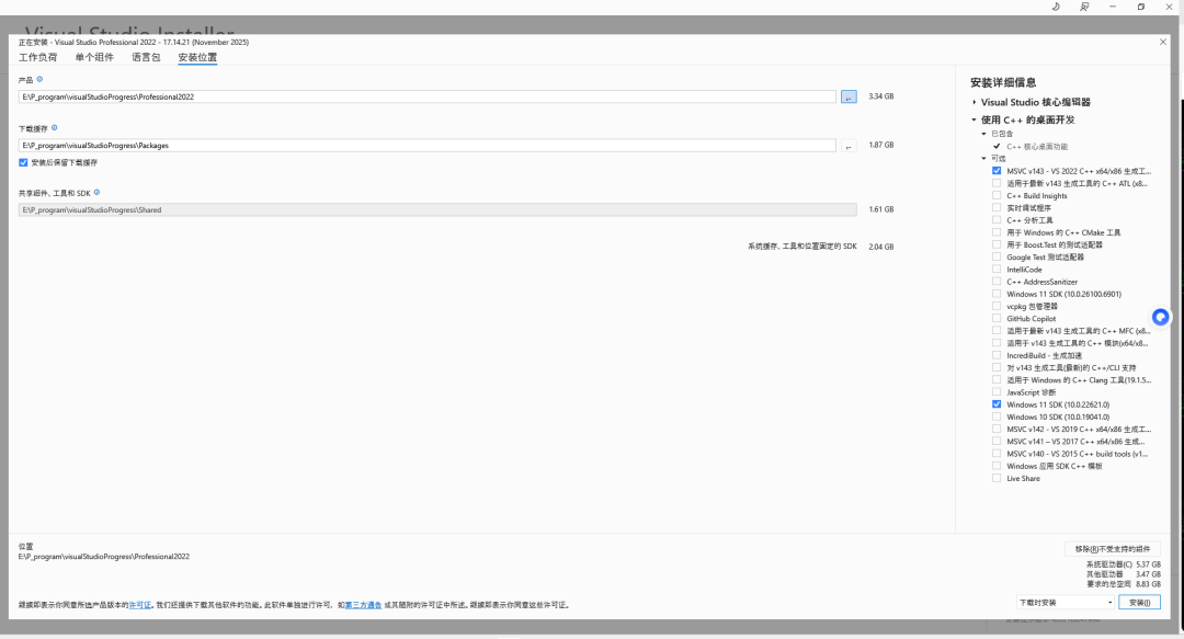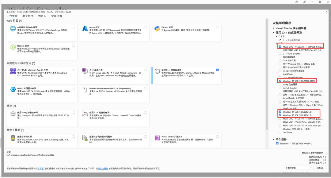 - 运行安装包,选择“C++ 桌面开发”,勾选“Windows SDK”(Win11系统勾选Win11 SDK,Win10勾选对应版本,建议同时勾选Win10和Win11 SDK,避免兼容问题)。