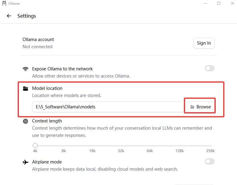 打开Ollama客户端,点击settings(设置),找到Model location(模型位置)选项,将路径修改为上述新建的models文件夹路径。