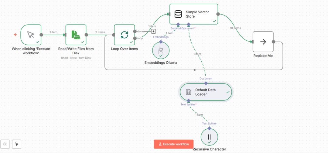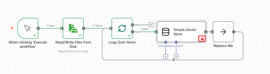 文档处理链路(向量化存储)完整工作流如下,确保所有节点无红色感叹号,执行测试无报错: