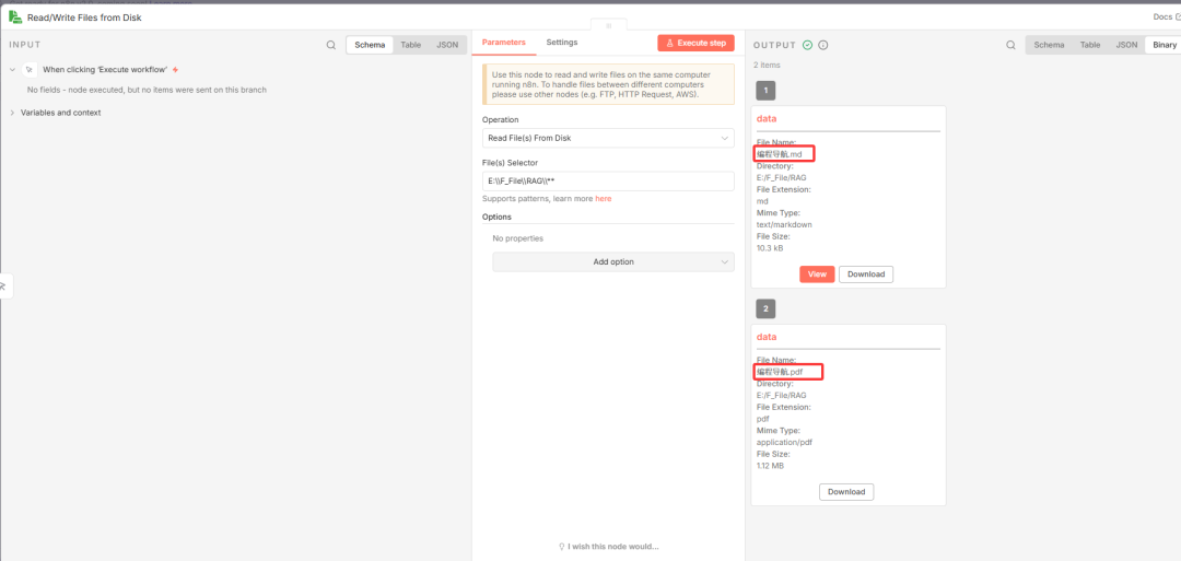 \4. 测试验证:点击节点旁的“测试”按钮,提示成功后,可查看右侧输出结果,确认能正常读取文件夹内的文件(如MD、PDF)。