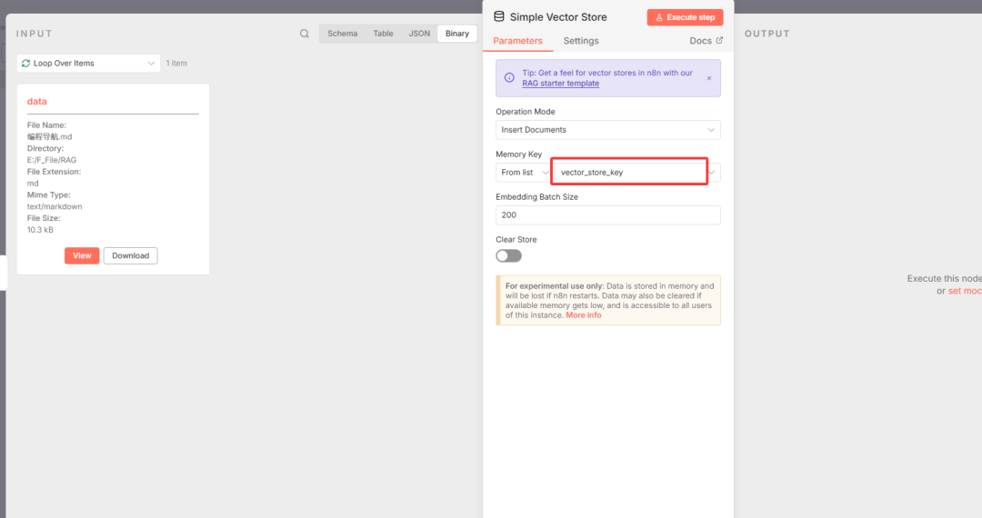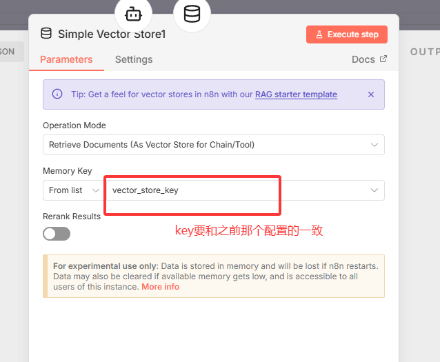 Answer questions with vector store工具的Vector Store配置项中,选择Simple Vector Store,并确保Memory key与文档处理链路的Memory key一致。