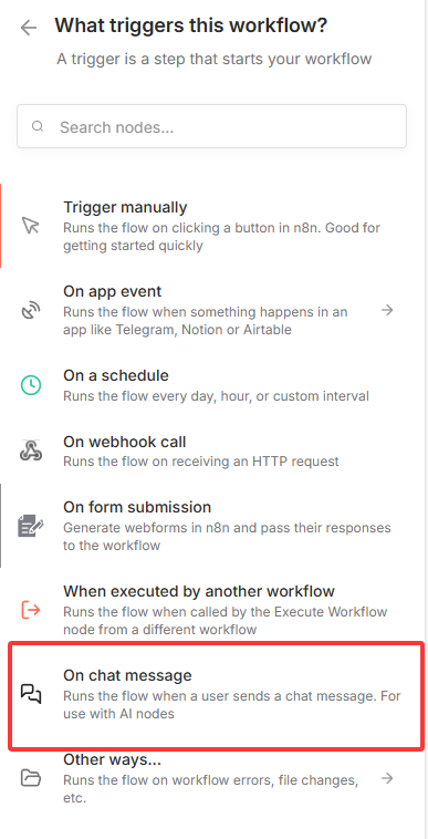 On chat message(聊天消息触发,支持用户直接输入问题)。