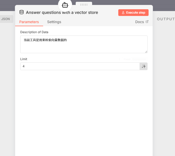 Answer questions with vector store(使用向量存储回答问题)工具,在“描述”中填入:“该工具用于检索向量数据库中的知识库内容,辅助回答用户问题”。