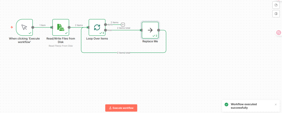 \3. 执行测试:点击工作流顶部的“执行”按钮,验证循环节点能正常衔接文件读取节点,处理所有文件。