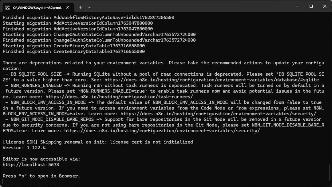 环境配置完成后,在CMD中输入n8n命令即可启动服务: