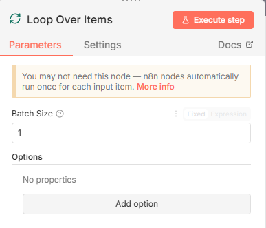 Loop over Items,选择该节点(中文文档参考:https://docs.n8ncn.io/integrations/builtin/core-nodes/n8n-nodes-base.splitinbatches/)。 - 配置参数: