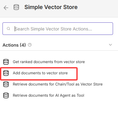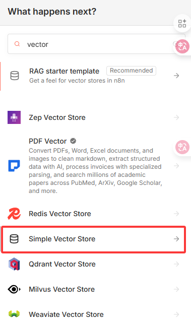 Vector节点,新手推荐选择Simple Vector Store(简易向量存储,适合学习演示;生产环境可替换为Pinecone、Milvus等专业向量数据库)。 - 选择操作:勾选