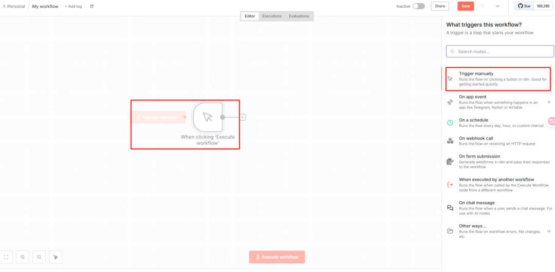 为方便测试,先选择手动触发方式(Trigger manually),后续可根据实际需求替换为定时触发、API触发等。