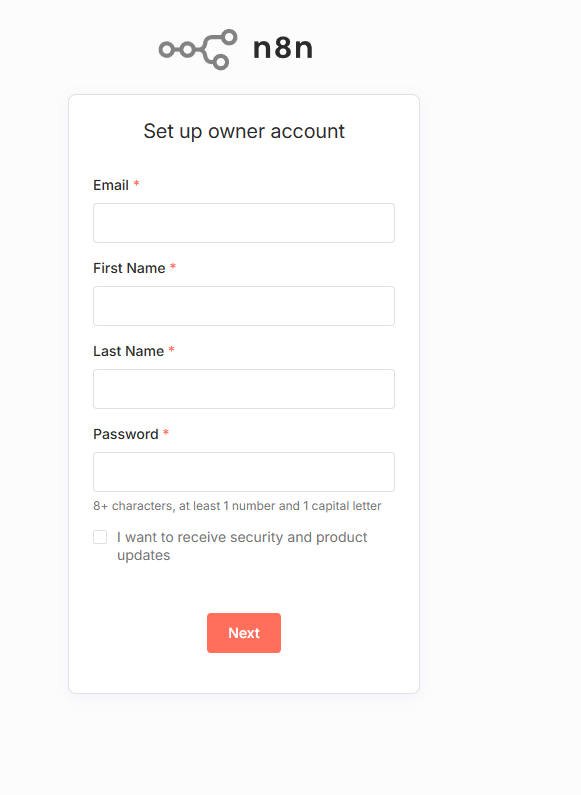 启动成功后,打开浏览器,输入http://localhost:5678/setup即可进入n8n初始化页面。