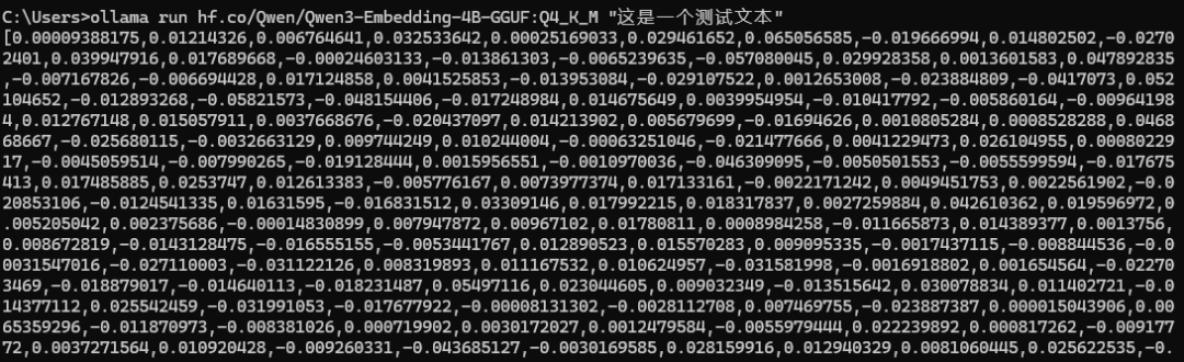 ollama run hf.co/Qwen/Qwen3-Embedding-4B-GGUF:Q4_K_M "这是一个测试文本"