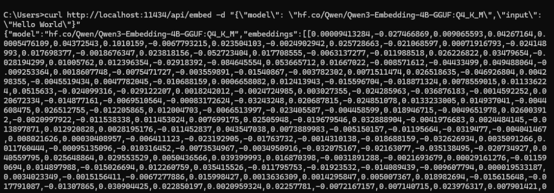 curl http://localhost:11434/api/embed -d "{\"model\": \"hf.co/Qwen/Qwen3-Embedding-4B-GGUF:Q4_K_M\",\"input\": \"Hello World\"}"