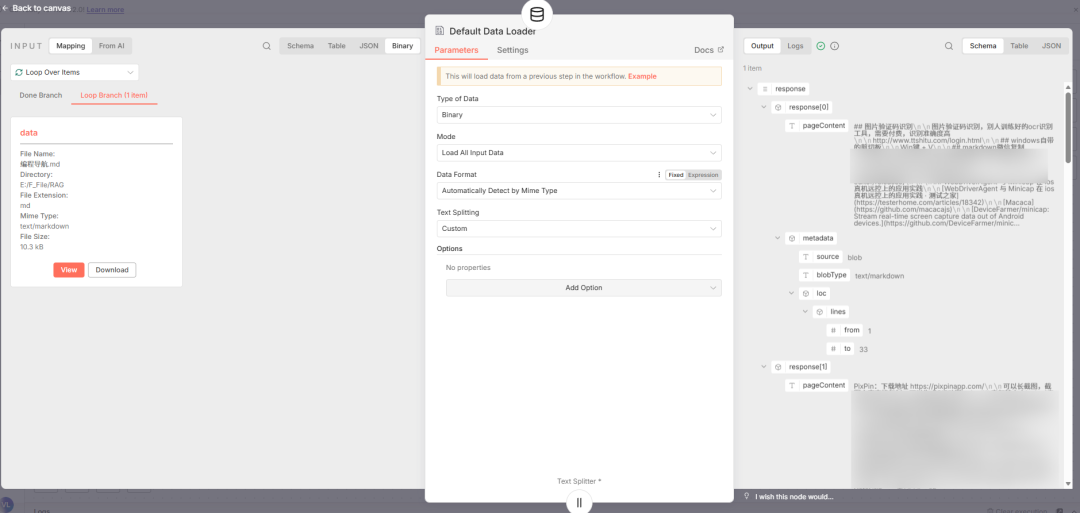 Type of Data:选择Binary(二进制,适配PDF、MD等本地文件)。Mode:默认Load All Input Data(加载所有输入数据)。Data Format:选择Auto Detect(自动解析文件格式),或根据实际文件类型手动选择。Text Splitting:选择Custom(自定义分块,提升检索精度)。