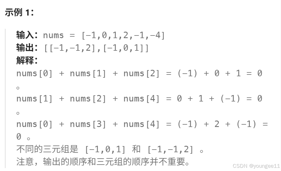给定一个数组,判断是否存在三元组判断是否存在三元组 [nums[i], nums[j], nums[k]] 满足 i != j、i != k 且 j != k ,同时还满足 nums[i] + nums[j] + nums[k] == 0 。请你返回所有和为 0 且不重复的三元组。