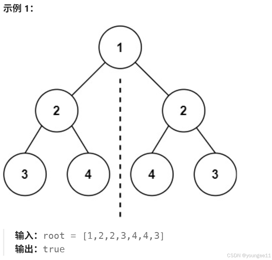 1、这个函数是给定一个节点判断是否轴对称,不能在这个函数里写递归,因为左子树、右子树不对称,可能整个树是对称的。所以写一个传左右子节点的函数,判断是否轴对称。终止条件:左子节点和右子节点都为null返回true。当左子节点右子节点有一个为null,则不对称返回false,判断左右子节点的值如果不等则返回false。