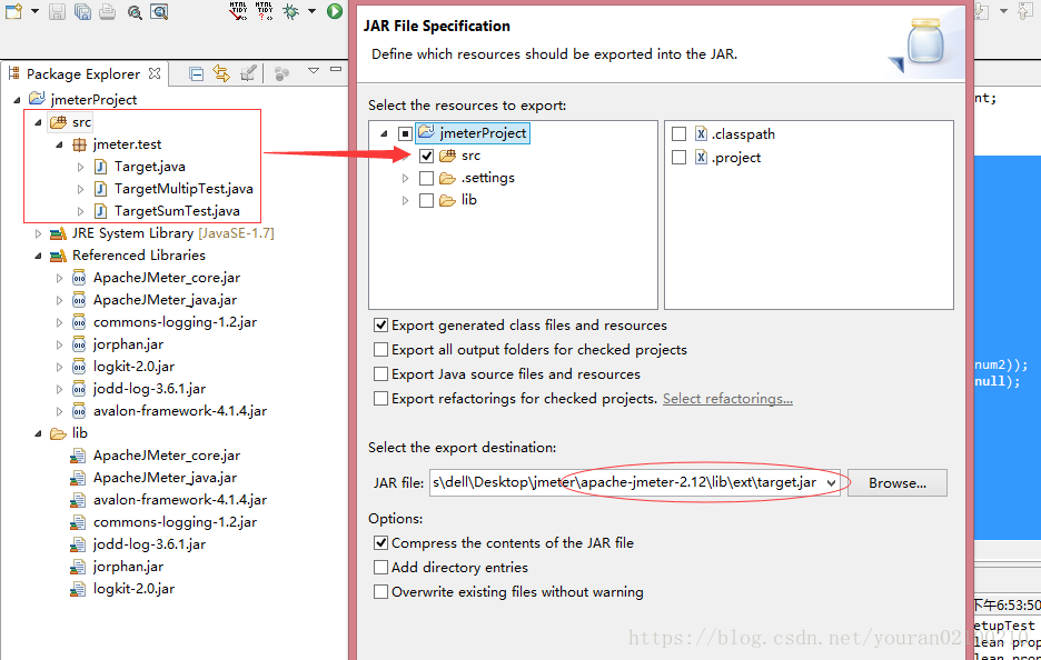 }4.将java工程导出为jar包,只需要导出src目录即可。并将导出的jar拷贝到jmeter安装目录下的 /lib/ext下。