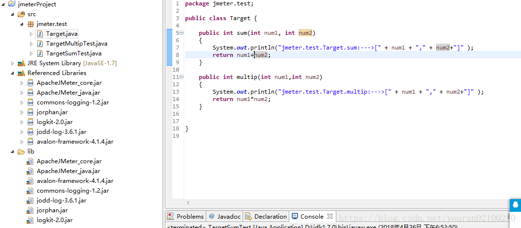 2.创建需要测试的java类Target,编写sum和mutiple待测方法。