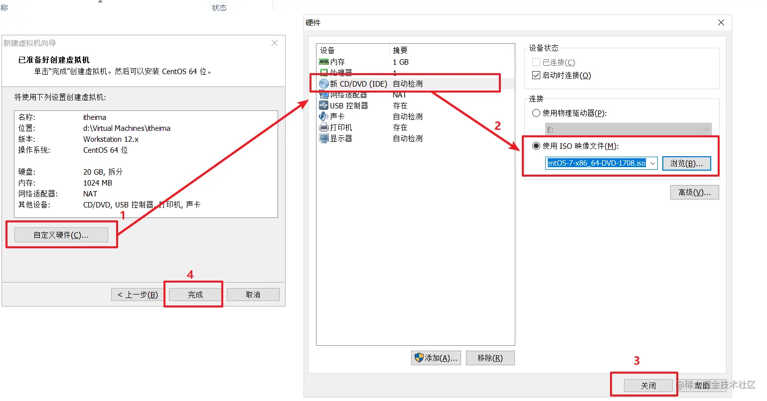 准备安装前的硬件设置,镜像文件就是百度云盘中的Centos7镜像文件。