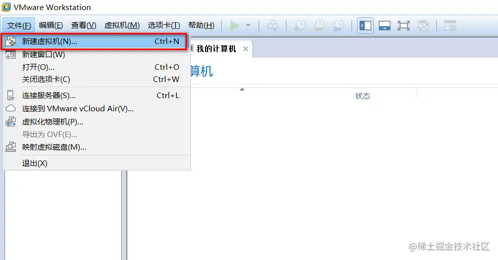在虚拟机的主界面中,点击 文件 -->新建虚拟机 创建一台新虚拟机