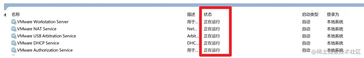 找到VMWare所有服务,并确保所有服务都已经正常运行