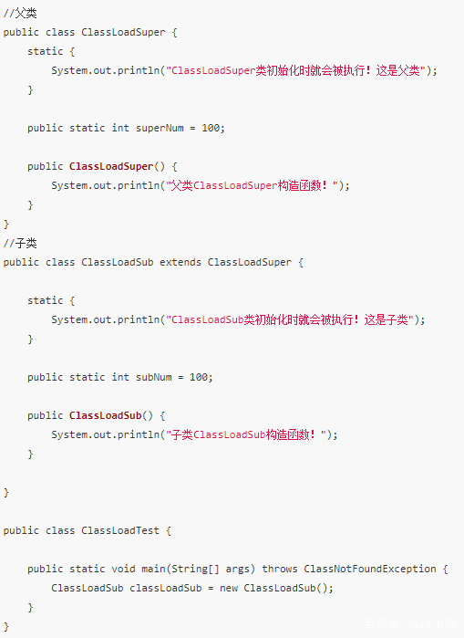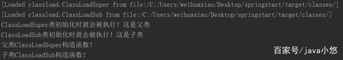 实例化子类ClassLoadSub的时候,发现父类ClassLoadSuper先被加载,因此当初始化一个类时,发现其父类还未初始化,则先触发父类的初始化