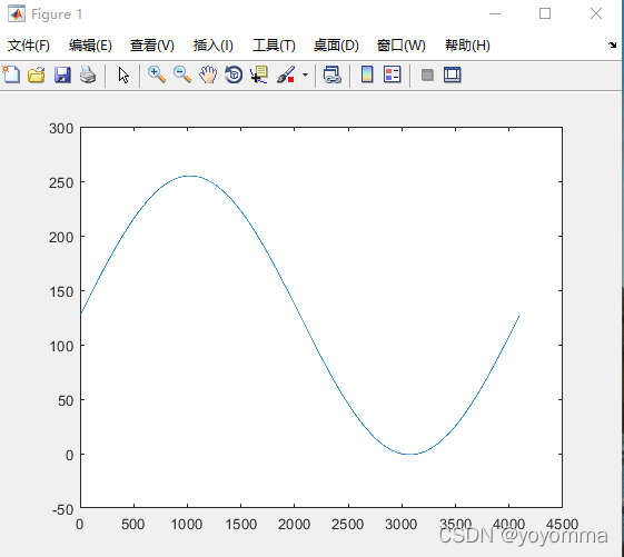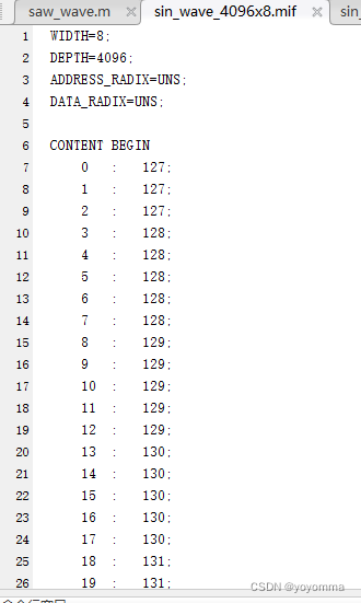利用matlab产生mif文件,在quartus里设置ROM IP核时调用mif文件即可。在matlab中沿横轴等间隔采样2^N=4096次,每次采集的信号幅度用1字节(8bit)数据表示(0~255),然后将采样结果(mif文件)按顺序写入ROM存储单元中。生成的mif文件部分内容如下图所示,冒号左侧为横轴地址,右侧为纵轴存储数据,可与上图中的正弦波横纵轴对应。