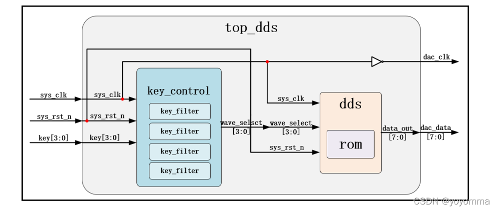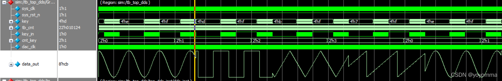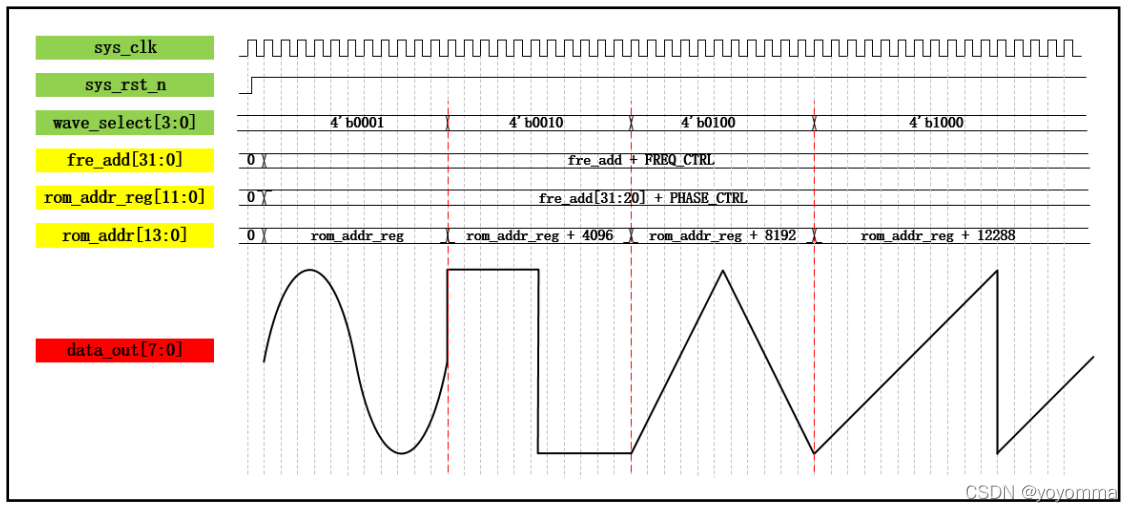 主要部分由加法器和累加寄存器(在频率控制字K变化时不会干扰相位累加器工作)组成。简单来说:首先,K值输入,加上相位累加器原先寄存的值(位宽为N),再传到累加寄存器中生成相位码;然后,相位累加器和相位调制器生成的值(地址即横轴)传入ROM表,ROM表会事先存储我们要显示一个完整周期的正弦波信号,相应的地址(横轴)对应所存储的数据(纵轴)。