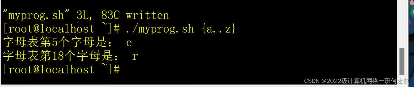 [root@localhost ~]# ./myprog.sh {a..z} ##执行脚本,使用字母表的参数