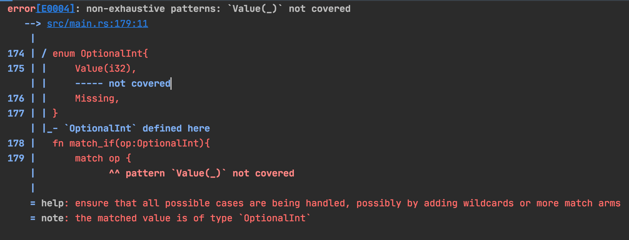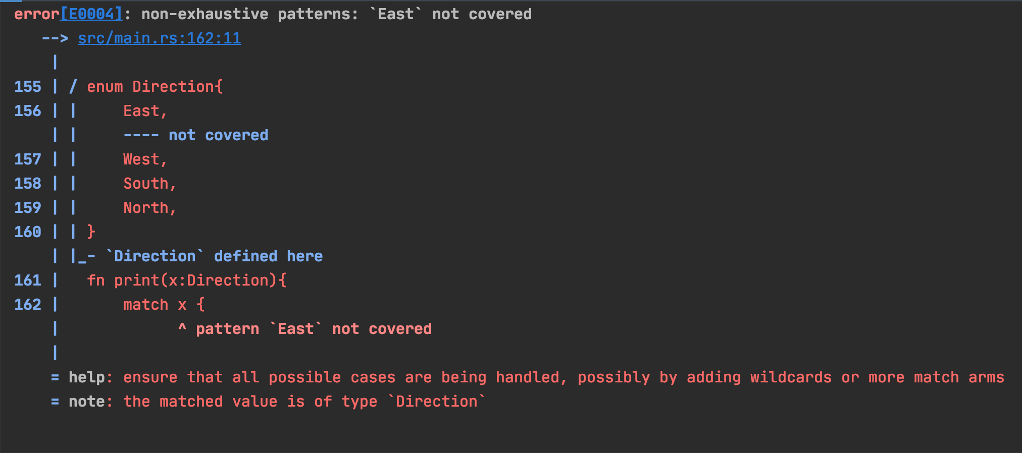对应到 match 表达式上,Rust 要求 match 需要对所有的情况做彻底的,无遗漏的匹配。比如对于上面的例子,我们删除一个匹配分支(East)