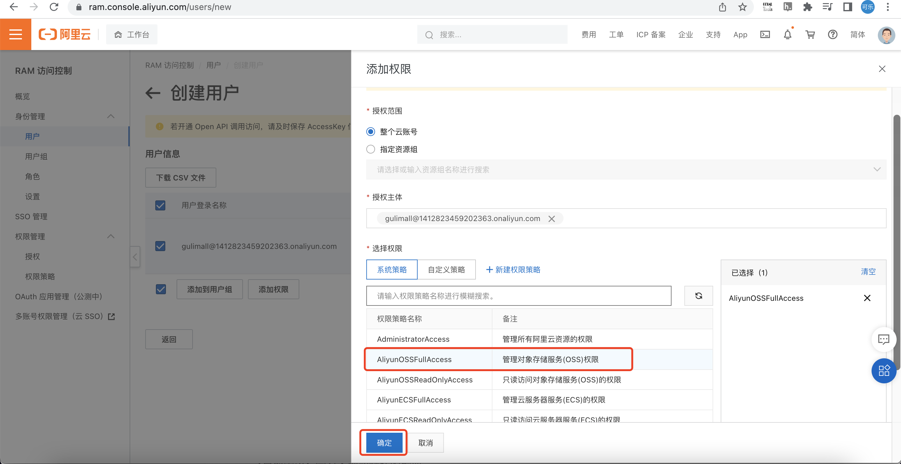8、给子账户分配OSS管理权限