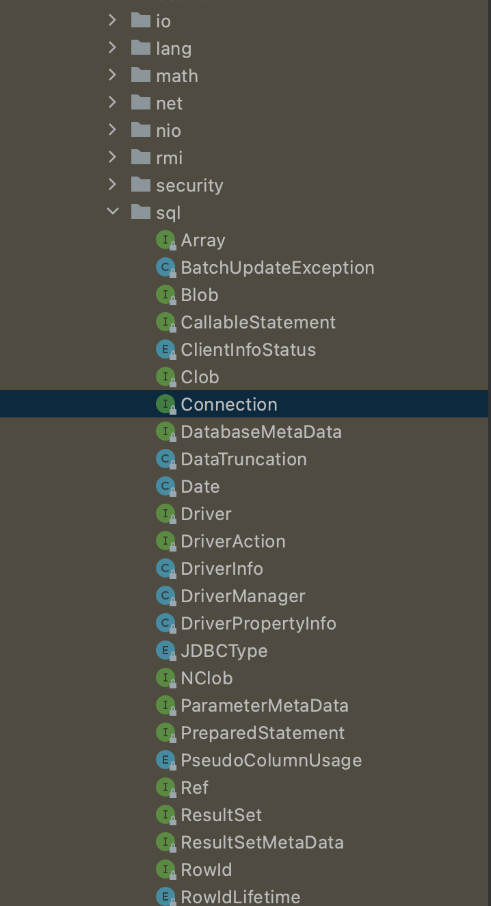 下面介绍几个关键的接口,注意这都是JDK内部提供的一些接口,具体实现得看具体的数据库驱动,比如MySQL,我们通常会在maven或gradle配置mysql-connectior-java ,下面接口的具体实现就在其中。