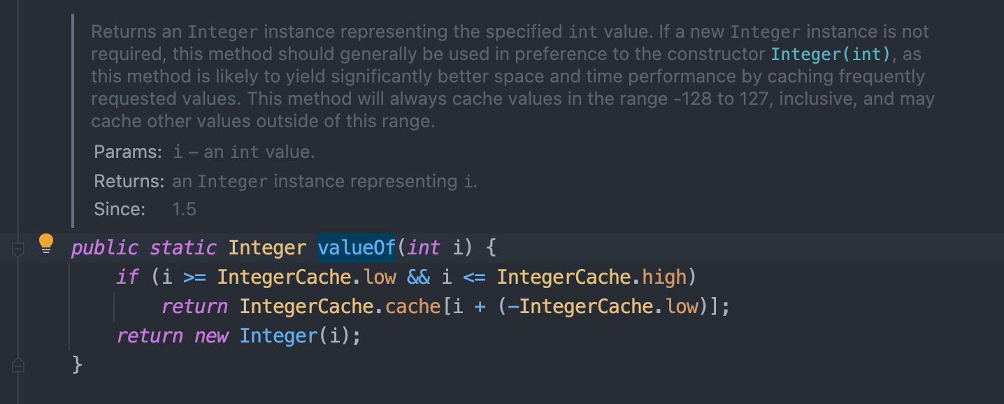 其实这部分源码不难理解,首先对于 valueOf 方法,当传入的整型值在 -128-127 之间时,返回的是 IntegerCache 里面的值。