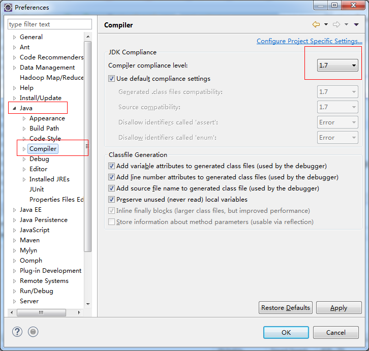 Windows---->Preferences---->Java---->Compiler