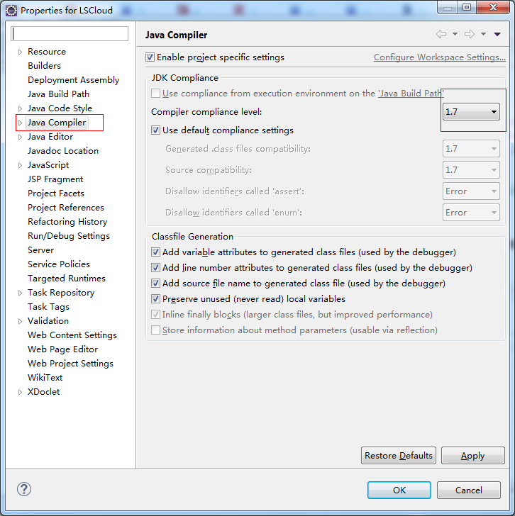 右击项目---->Properties---->Java Compiler