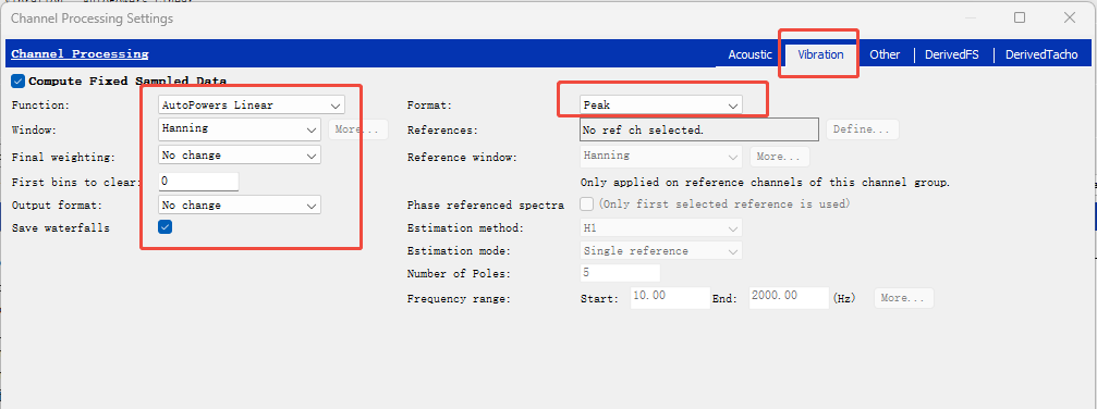 ④Output format(在频域中直接转换信号的物理类型):Acceleration(加速度),Velocity(速度),Displacement(位移),假设你使用加速度传感器测量得到的是加速度信号,但你想观察速度或位移。你无需更换传感器,也无需在采集硬件上做任何改动,只需在软件中通过 Output Format 选择即可