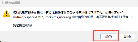 运行“lms_user.reg”文件,确认将信息写入Windows注册表