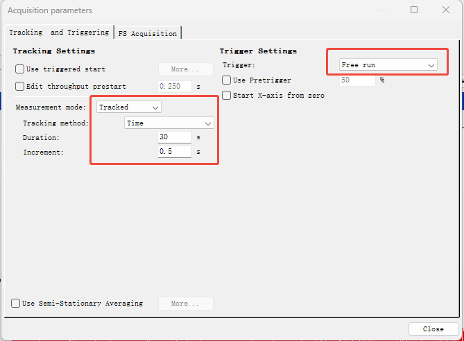 ① Measurement mode:Tracked(跟踪)对切片的每一段时域做频域变换之后不取平均(三维);而Stationary(稳态)对切片的每一段时域做频域变换之后取平均(二维),默认选Tracked
