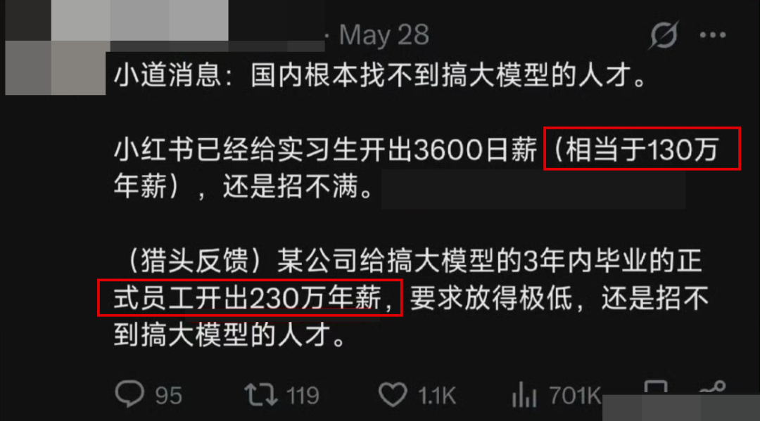 最近,一张热帖截图在程序员圈子疯传:“国内根本找不到搞大模型的人才!小红书给实习生开3600日薪。某公司给3年内毕业的正式员工开出230万年薪,要求极低,依然招不到人!”