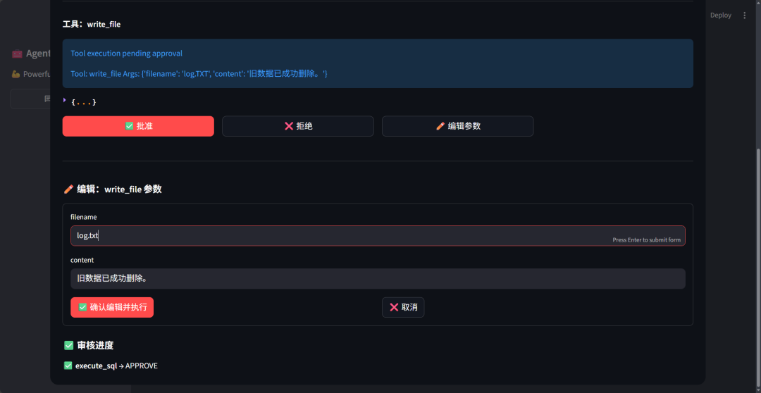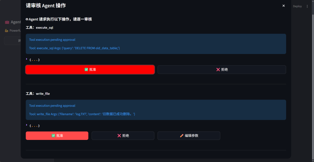 Agent 在收集到审核人相应的决策(决策以列表形式提供,每个待审核的操作对应一个决策。)之后,再恢复执行整个流程。