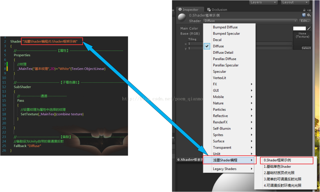 这里选择的菜单取决于我们Shader中定义Shader的第一行代码时紧接着Shader关键字的引号“”里面的书写方式:
