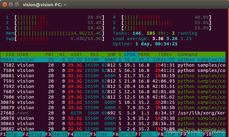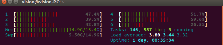 最上面的三行,1——6 表示的是CPU的核数,本图中CPU是6核的。