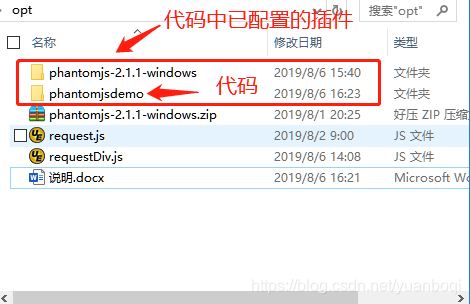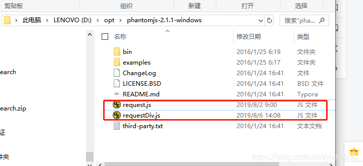 2.解压完成后,需要 js 脚本,来当 phantomjs 的参数被调用,这里将写好的request.js、requestDiv.js复制到D:\opt\phantomjs-1.1-windows目录下如图: