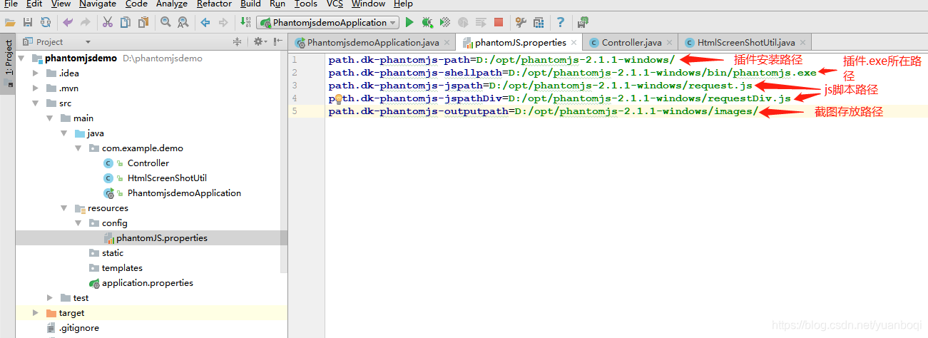 4.对SpringBoot项目中D:\phantomjsdemo\src\main\resources\config\phantomJS.properties文件进行配置