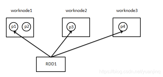 - 是一组分区(partition),类似hadoop,能够被切分,从而实现并行计算,如图1所示,RDD1中有3个区分(p1,p3,p4),分别存储在3个节点上