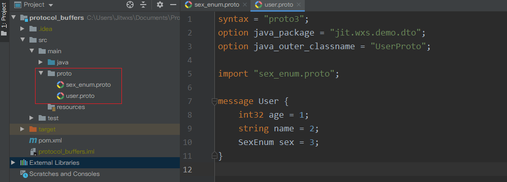 首先创建一个关于性别的 Protobuf 枚举类 sex_enum.proto,用于标识男女: